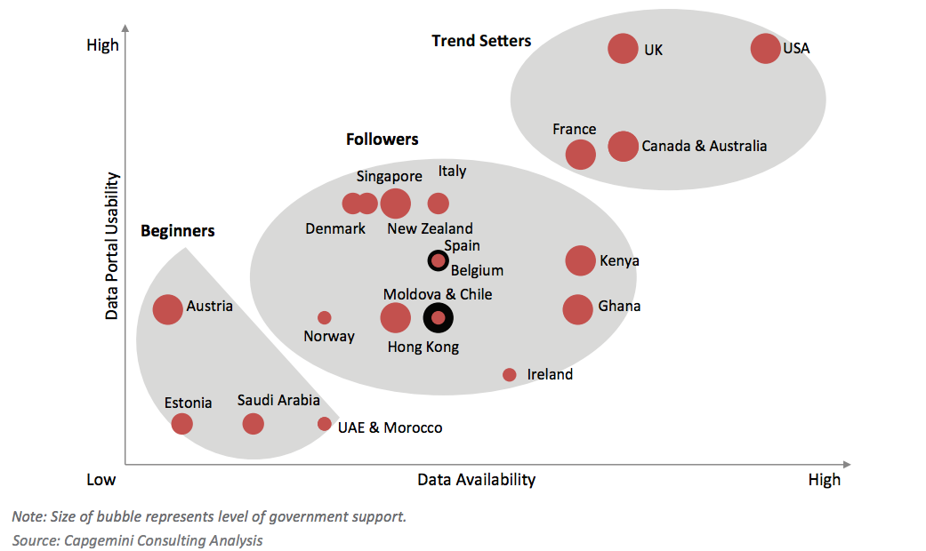 Many governments from around the world are moving towards opening their data sets. The European Union is working on regulations to unlock the data held by European Institutions and the American government has an open data initiative that was launched in 2011. In addition, the Australian Government has developed a big data strategy with the objective to make the data held by the National or Regional authority publicly available. With the big datastrategy the Australian Government wants to make sure that governments and organizations take full advantage of all the big data benefits while ensuring the privacy is protected. But there are more countries of course and a report by Capgemini Consulting on the Open Data Economy showed that countries can be subdivided in three different categories regarding opening their datasets: Beginners, Followers and Trend Setters. They analyzed 23 countries and currently 22% of countries shared data that can be classified as comprehensive – data with high value information, granular in nature and including extensive datasets, so there is still a lot of work to be done.